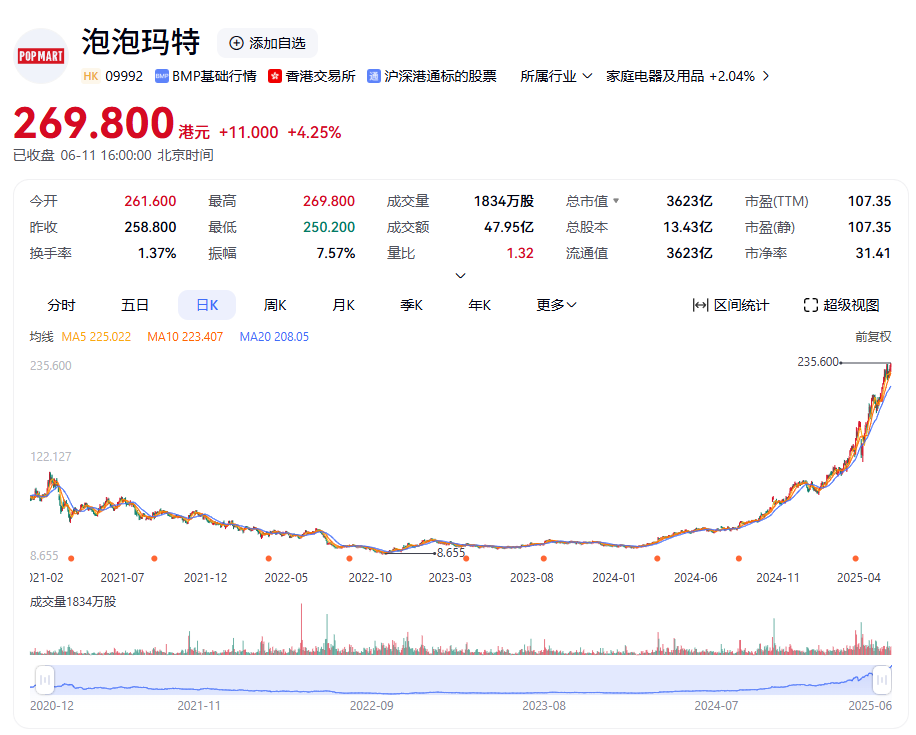 泡泡玛特(09992)今日上涨4.25%,股价269.800港元/股继续创下历史新高,总市值高达3223亿港元。与38.5港元发行价相比,已经翻了7倍;如果按历史最低价9.95港元(不复权)来算,泡泡玛特已经涨了27倍。