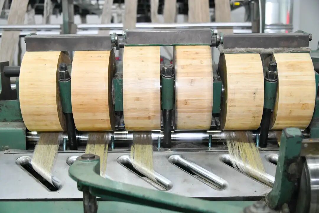 走进“亚麻超级工厂”的崭新车间,一捆捆从法国、比利时进口的原麻正被摞在机器旁。它们将经历分束、喂麻、并条、纺纱等8、9个步骤,转化为细如发丝的高支亚麻纱。
