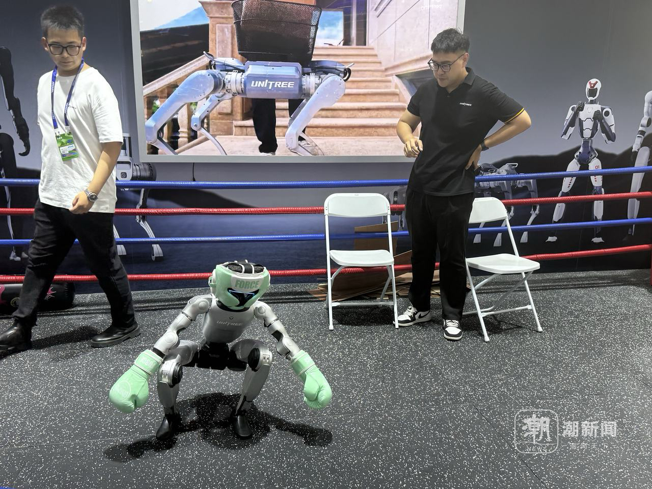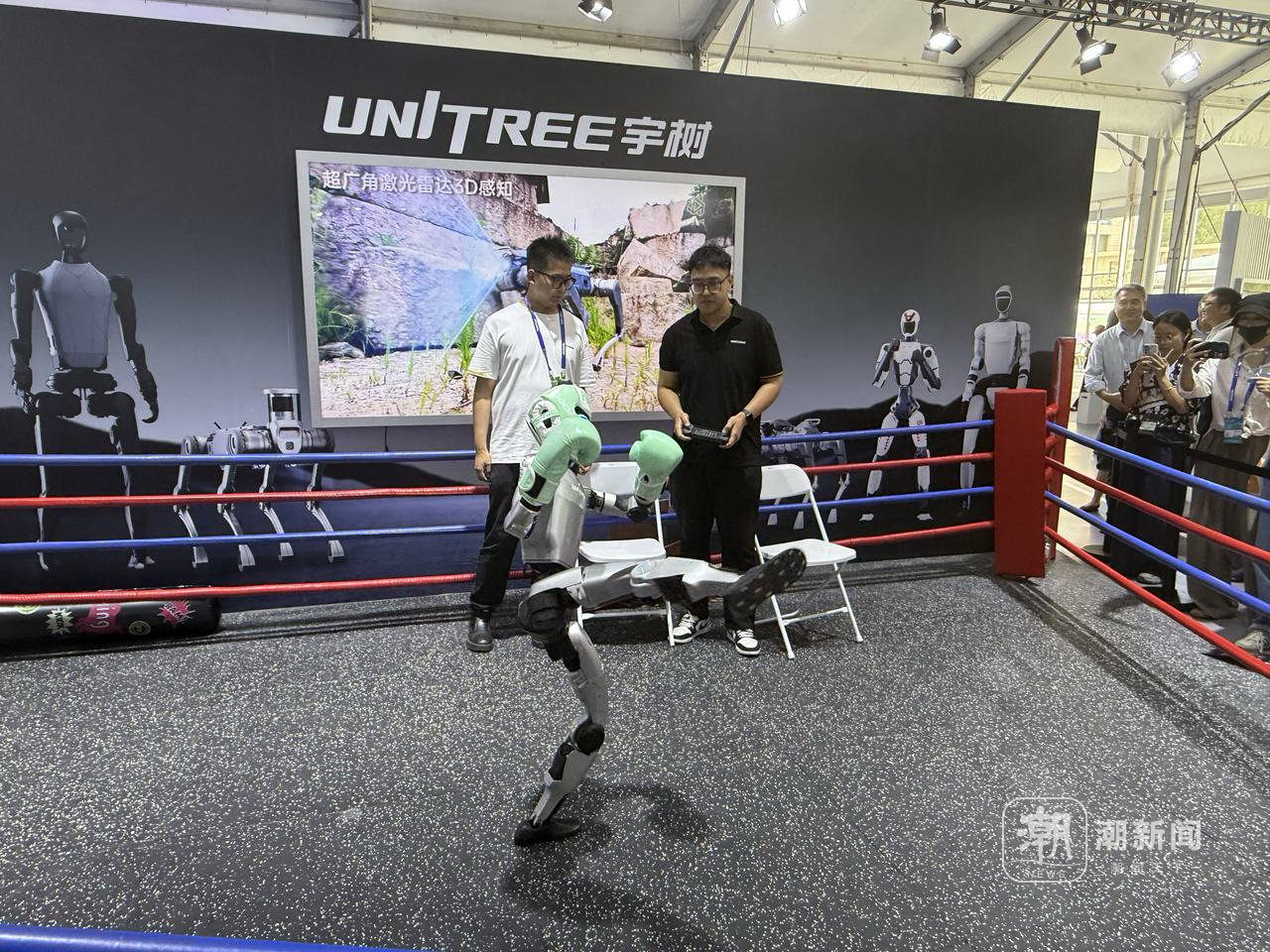 云栖大会3号馆化身为机器人演武场。宇树科技的人形机器人G1站在拳击台上,调整姿态,猛然出击,拳头迅猛有力,被击倒后,还像人一样爬起,抬腿把面前的纸板劈开,引起阵阵欢呼。工程师介绍,这背后是模仿学习和强化学习技术的结合,使机器人能快速掌握复杂动作逻辑。