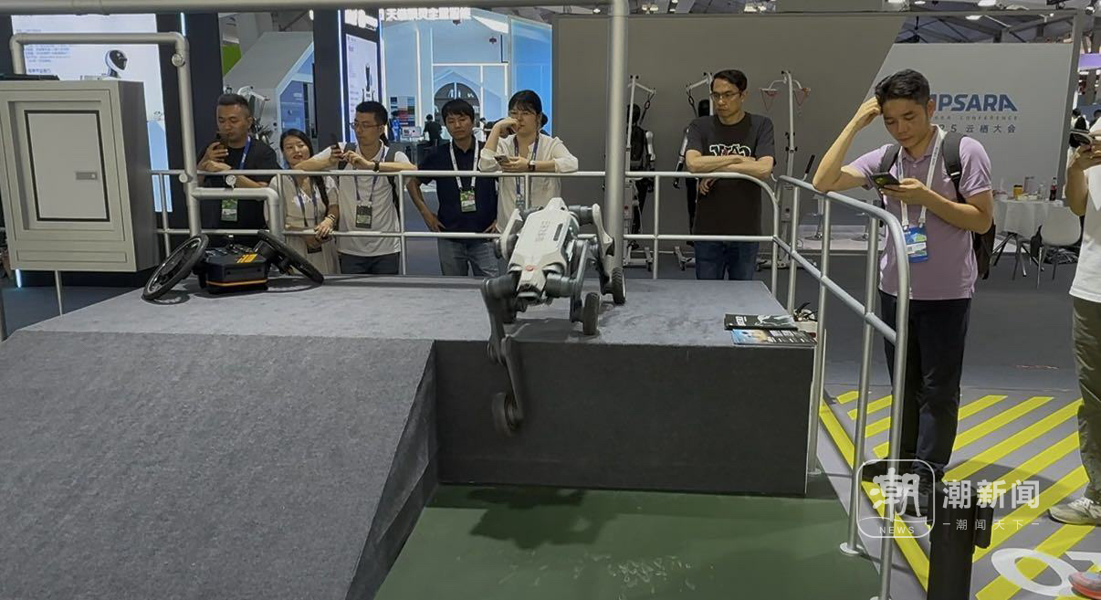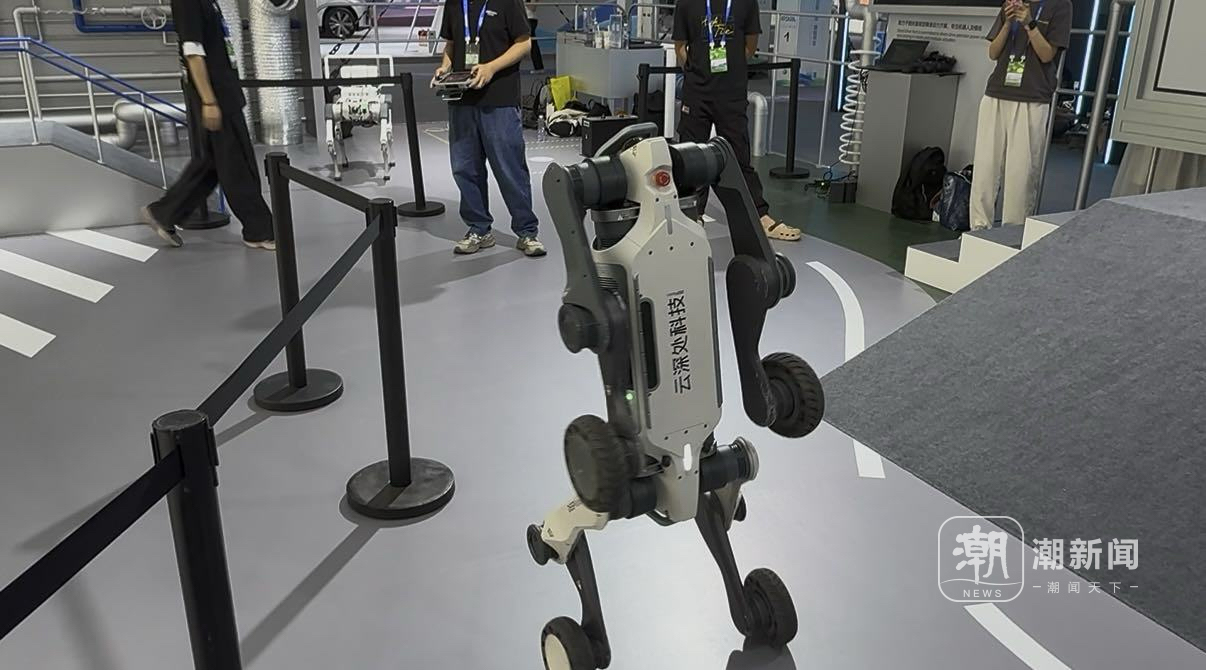 隔壁,云深处科技的山猫M20正在攀爬高台,从高处爬下来后,还双腿直立,表演起了花滑运动员的倒退动作,很是丝滑。边上的“绝影X30”四足机器人正在模拟电力巡检场景,准确识别各类仪表数据。这些机器人已不是实验室的玩物,而是在宁波钢铁50℃高温高炉替代人工巡检,在可可西里无人区协助科考。