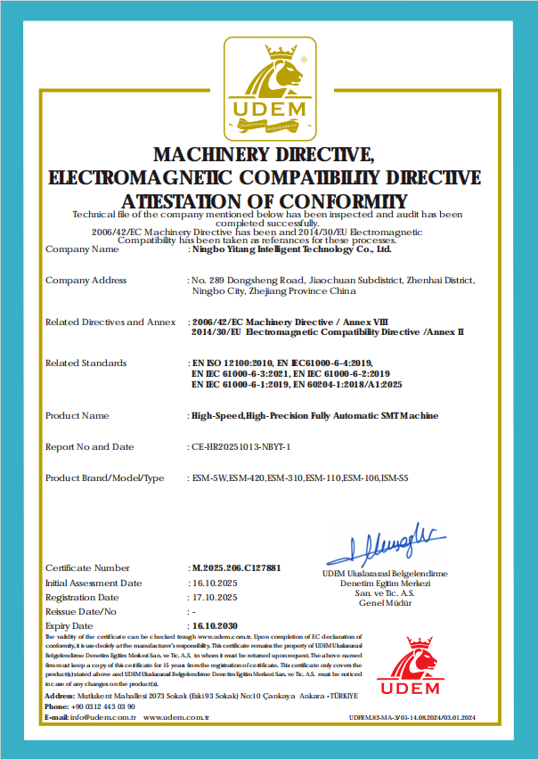 近日,国内SMT装备领域创新先锋宁波亦唐智能科技有限公司(下文简称“亦唐科技”)自主研发的高速、高精度全自动表面贴装技术(SMT)设备顺利通过欧盟CE认证,正式获得进入欧盟及欧洲经济区市场的“通行证”。这不仅标志着“亦唐智造”在核心技术与产品品质上实现国际对标,更代表着中国电子装备企业在全球智能制造赛道上的硬核竞争力。