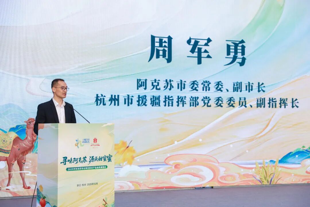 杭州市援疆指挥部副指挥长周军勇在致辞中用一组扎实的数据,展示了产业援疆的成效。他介绍,在全力推进“十城百店·浙疆有礼”工程两年多来,杭州市援疆指挥部累计组织50余场产销对接会,推动阿克苏农产品在杭州及长三角地区销量突破15万吨,销售额超26亿元。
