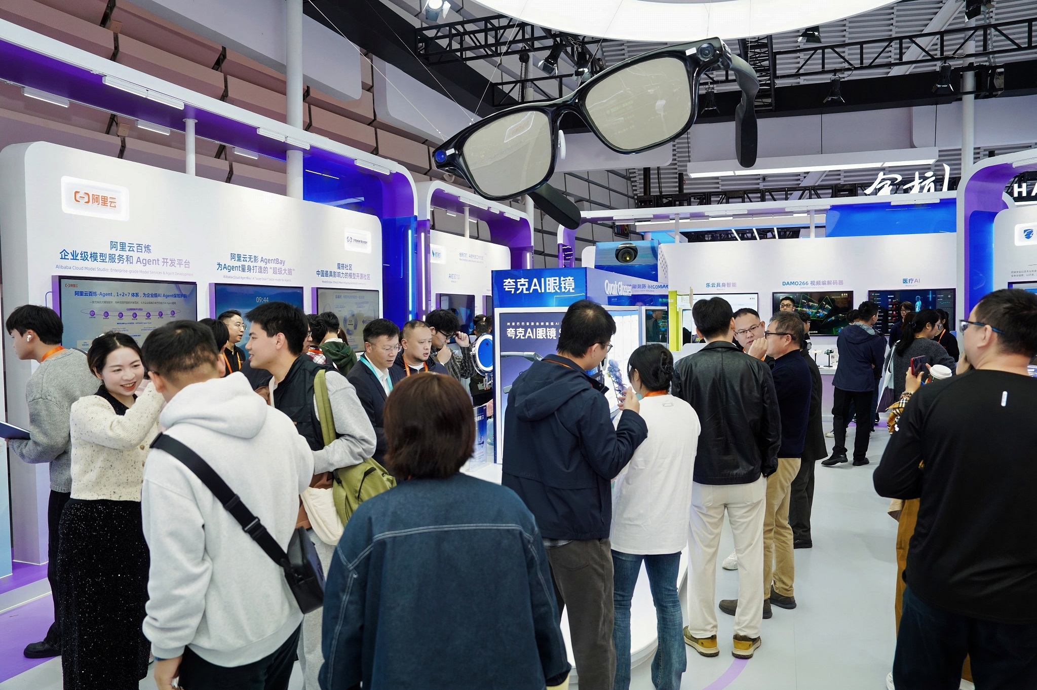 图说:图为现场观众在阿里巴巴展台体验夸克AI眼镜。