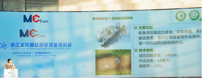 紧随其后,省农机院农业机械研究所所长郑涛也发布了“茭白联合收获机”“温室智能巡检搬运机器人”“蔬菜种苗自动嫁接机”等多个最新科研成果,他表示:“作为产业集群促进组织,近年来,我们紧盯农业产业‘机器换人’上存在的短板,在‘尖兵领雁’‘农业双强’等项目支持下,研制了一批丘陵山地适用农机装备,取得了较好成效。”他也向在座企业发出邀约,期待能够加强企研合作,将科研新成果产业化推向市场。