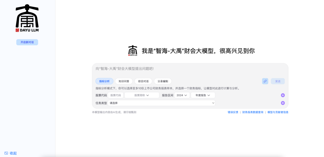 “智海-大禹”财会大模型是由浙江大学ZIFA智能财务研究团队设计研发的全国首个财会领域大模型。自2024年6月发布1.0版本以来,该模型不断迭代创新,持续关注财会领域大模型应用的痛点。“智海-大禹”2.0版本基于DeepSeek推理大模型研发,为使用者提供基于上市公司真实数据的财务报表分析、理论知识问答服务,旨在推动财务报表分析工作的实务与教学范式变革,进一步赋能财会学科课程改革与人才培养。