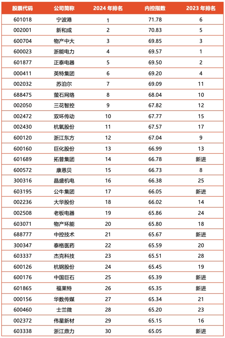 在今年的内控30强榜单中,宁波港、新和成、物产中大、浙能电力、正泰电器、英特集团、三花智控、双环传动、杭氧股份、浙江东方、巨化股份、康恩贝、晶盛机电、大华股份、老板电器、泰格医药、杰克科技、华数传媒、士兰微、伟星新材等20家企业连续五年进入浙江内控三十强。在新入榜力量中,有拓普集团、公牛集团、中控技术、中国巨石、福莱特、浙江鼎力这6家企业,其中拓普集团、公牛集团、中国巨石、福莱特、浙江鼎力重返内控三十强榜单,近五年累计上榜分别为2、3、2、3、2次,中控技术和杰克科技为首次上榜企业。