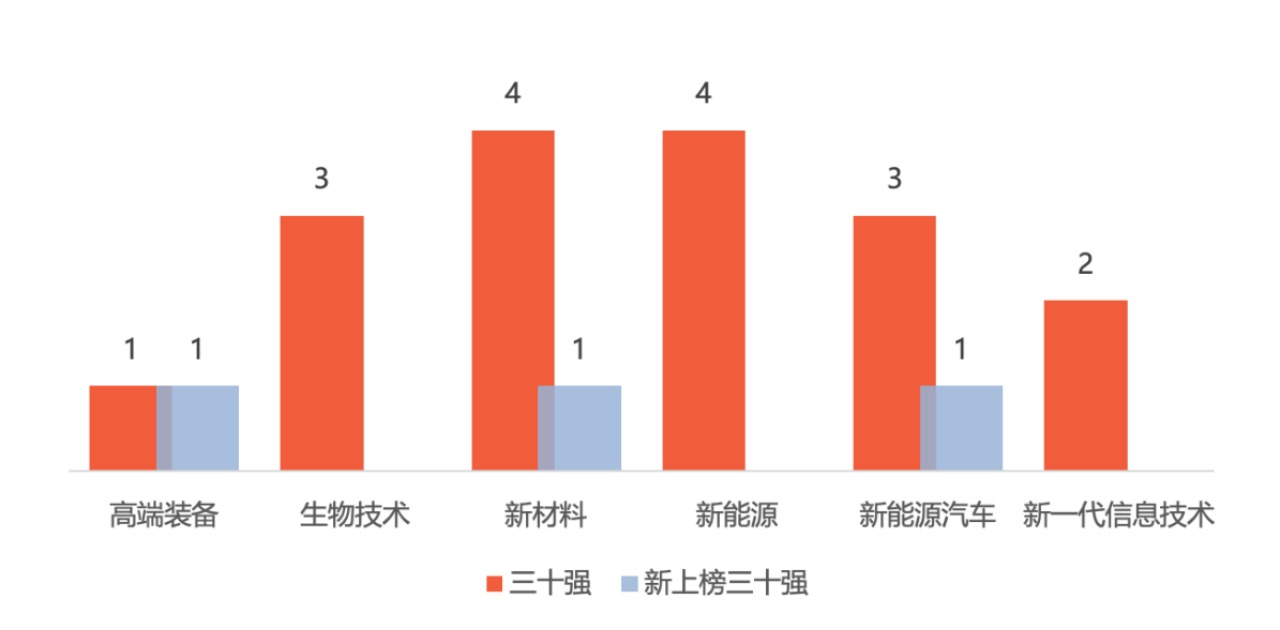 从产业分布来看,内控三十强中新兴产业相关公司超过半数。其中,上榜公司中属于新材料产业和新能源产业的企业最多,各有4家企业,其次是属于生物技术和新能源汽车产业的企业,各有3家,而新一代信息技术和高端装备产业相关企业相对较少。新上榜企业中有3家属于国家重点培育和发展的战略性新兴产业,占新上榜企业的一半,说明在我国加快做大做强战略性新兴产业的背景下,相关企业正逐步成为引领经济高质量发展的重要引擎。