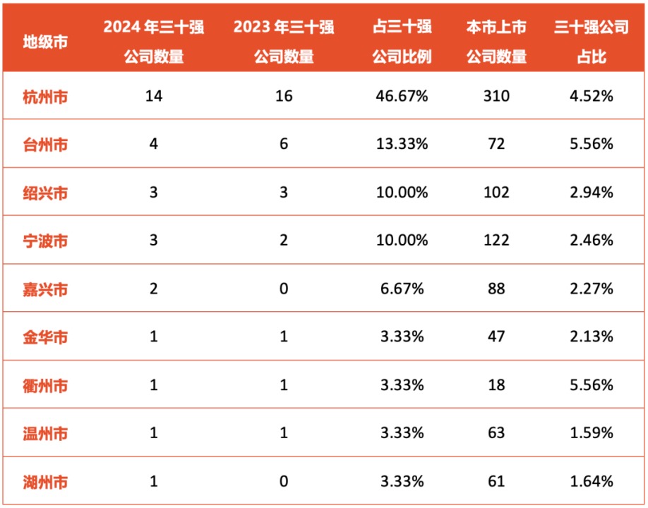 从地域分布来看,全省内控水平三强城市依次为杭州、台州和绍兴。在全省11个地级市中,9个城市产生了内控30强企业,比去年新增2个城市,表明各地级市的上市公司内部控制建设取得成效。