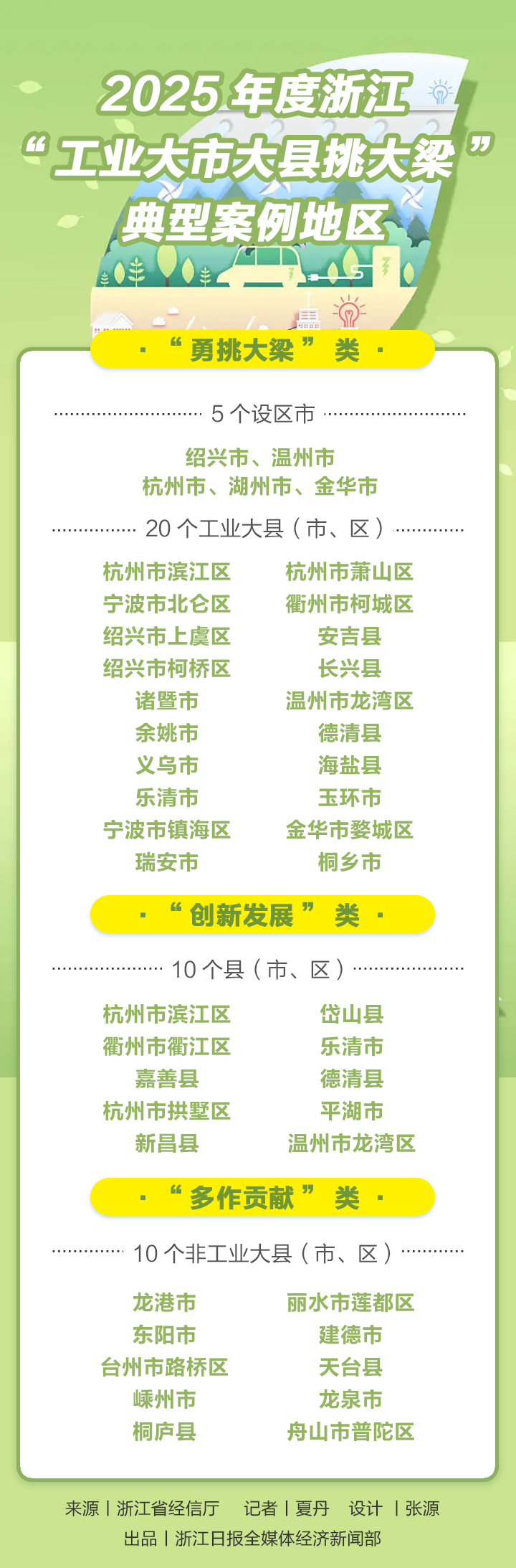 涌金君从省经信厅了解到,通过对11个设区市、45个工业大县的综合评价,分别选出5个大市、20个县(市、区),上榜年度“勇挑大梁”。