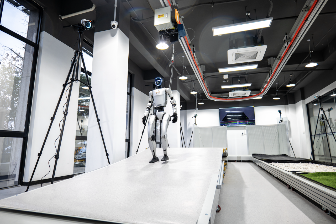 几乎每天,都有不同类型的人形机器人“走”进浙江检测中心室内测试区,接受严苛而系统的检验。场地内,30度倾斜的陡坡,挑战着机器人的平衡与攀爬能力;高低不同的台阶,则测试它们的步态规划与稳定性。
