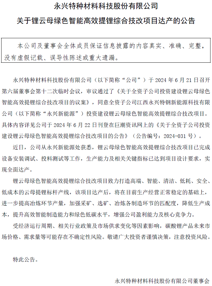 1月20日晚,永兴特种材料科技股份有限公司(证券代码:002756,简称:永兴材料)发布公告称,其全资子公司江西永兴特钢新能源科技有限公司投资建设的锂云母绿色智能高效提锂综合技改项目已全面达产,项目生产能力及相关关键指标已达到设计要求。