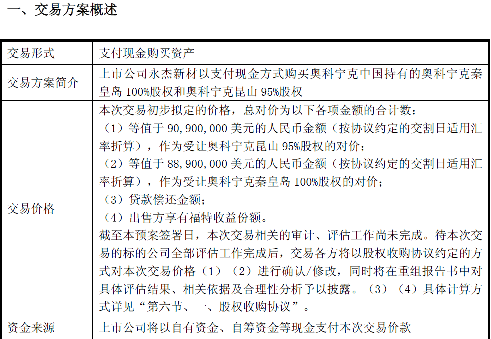 根据重大资产购买预案,永杰新材将以现金方式收购奥科宁克(秦皇岛)铝业有限公司100%股权及奥科宁克(昆山)铝业有限公司95%股权。
