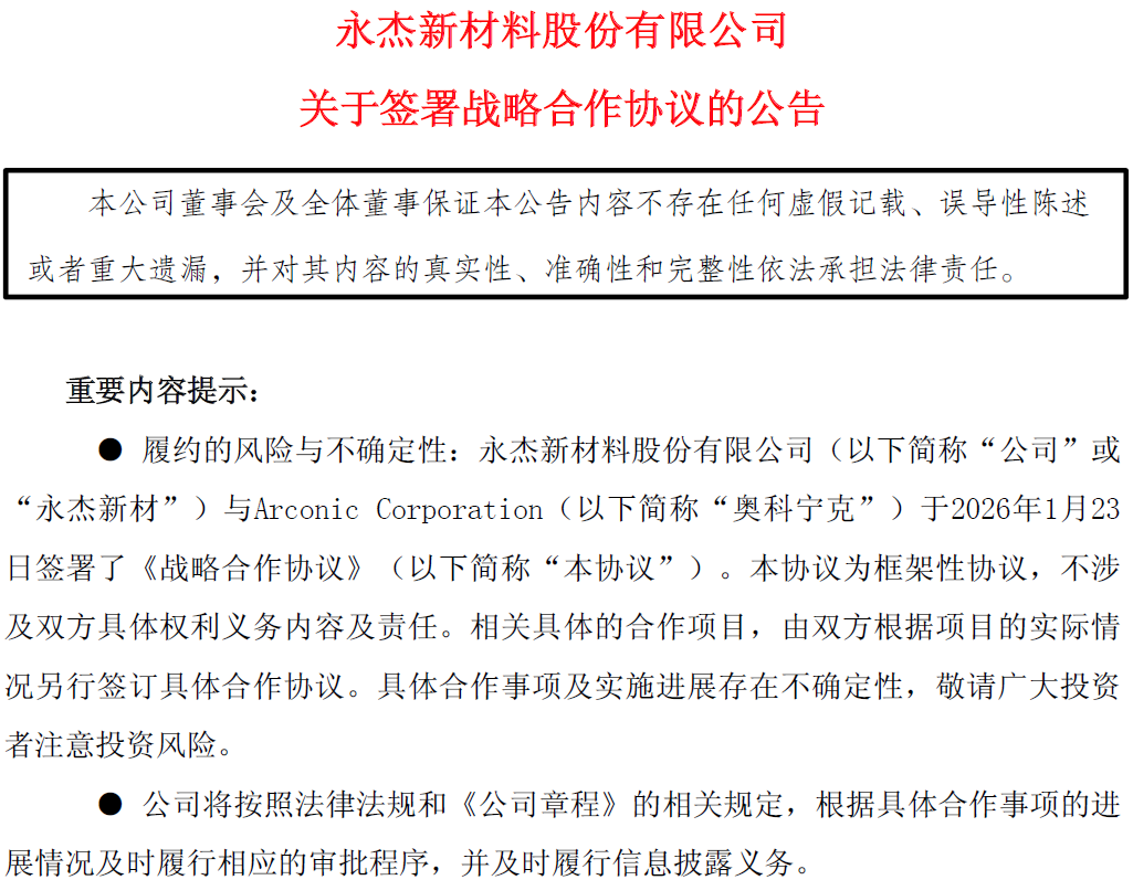 在宣布收购的同一日,永杰新材与奥科宁克的母公司Arconic Corporation签署了一份《战略合作协议》。