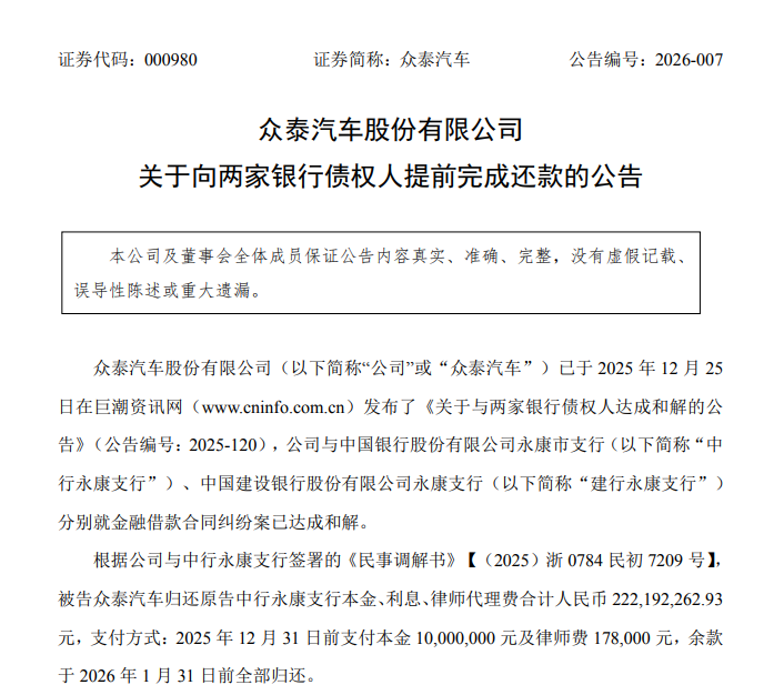 1月27日,众泰汽车发布公告,宣布已向中行永康支行、建行永康支行提前完成相关债务的还款。