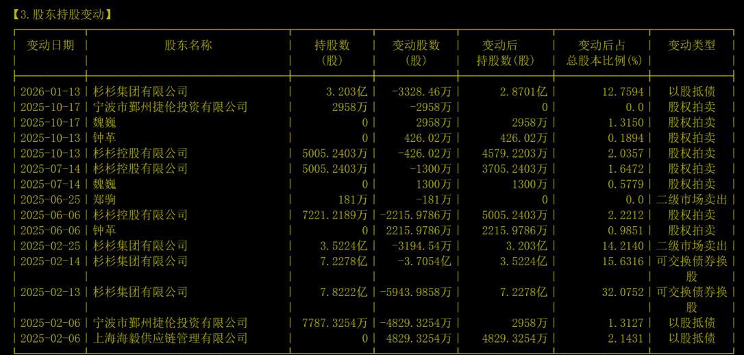 2025年2月,杉杉股份控股股东的一致行动人宁波市鄞州捷伦投资持有的4829.33万股被法院强制执行,以股抵债划拨至申请执行人上海海毅供应链管理有限公司名下;控股股东杉杉集团持有的3194.54万股股份通过集中竞价交易和大宗交易被司法处置;