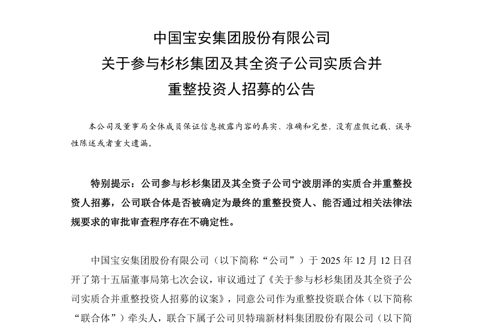 2025年12月13日,中国宝安发布公告称,公司作为重整投资联合体牵头人,联合下属子公司贝特瑞新材料集团及其他潜在投资人参与杉杉集团及其全资子公司宁波朋泽的实质合并重整投资人招募。随后几天,翰博控股集团也宣布参与。