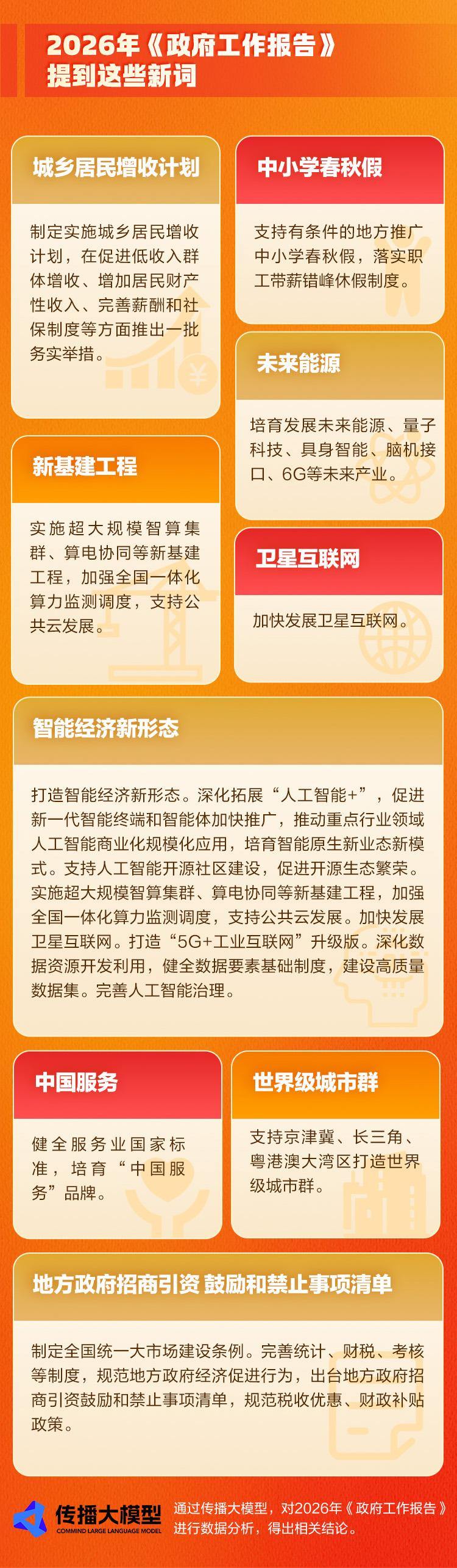 今年《政府工作报告》还提到了以往未曾提及的新词,比如“城乡居民增收计划”“中小学春秋假”“未来能源”“中国服务”“智能经济新形态”“新基建工程”“卫星互联网”“地方政府招商引资 鼓励和禁止事项清单”“世界级城市群”。