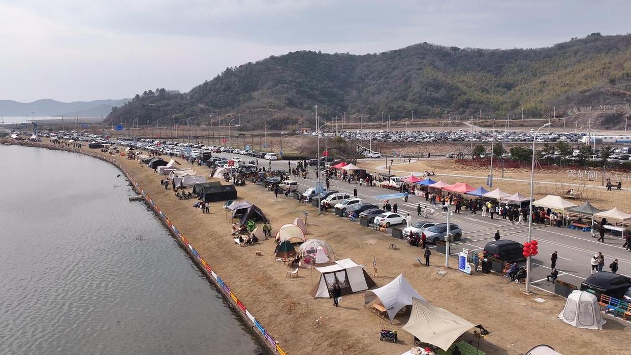 在宁波,宁波湾天妃湖露营区滨海风光独特,大片草坪临湾而设,春节后持续保持高人气,帐篷连片、亲子嬉戏、户外烧烤的热闹场景日日可见。