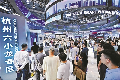 今年的数贸会将链接全球数字贸易新势力,催生数贸“百小龙”竞相涌现。图为第四届数贸会杭州六小龙专区。杭州市商务局供图