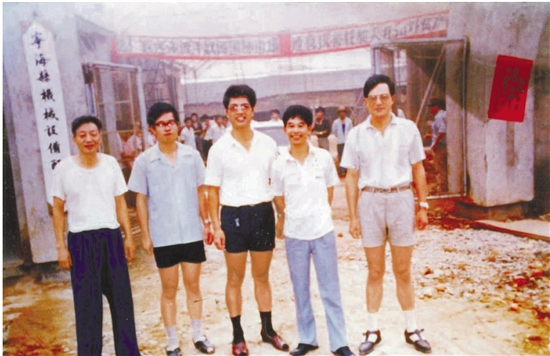 宁波如意公司前身——宁海县机械设备配件厂门口,储吉旺(中)和好友合影。受访者供图