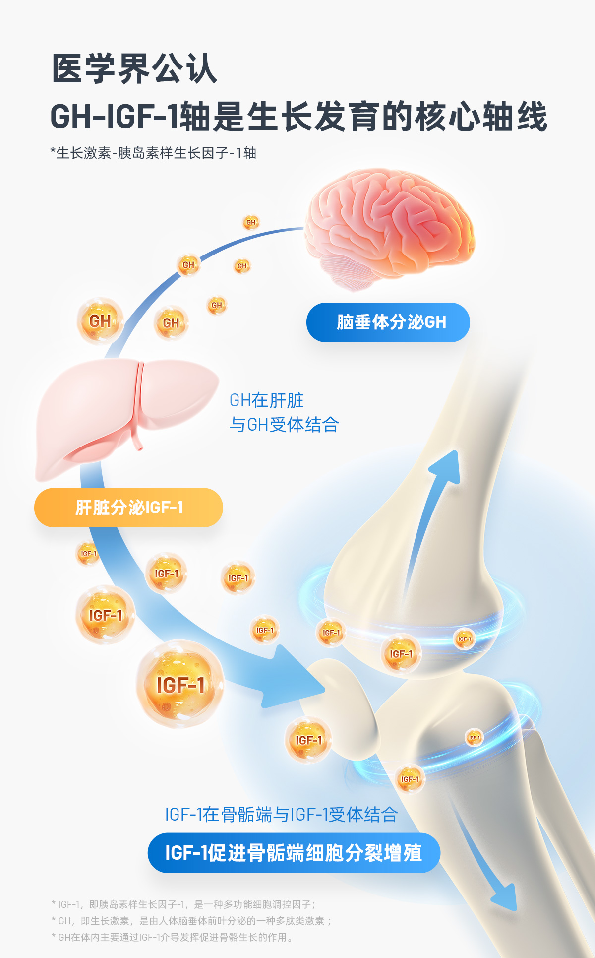 GH-IGF-1轴(生长激素-胰岛素样生长因子-1轴)是医学界公认的调节儿童生长发育的核心生理通路,其功能正常与否直接影响骨骼健康。阿基孚的核心机制直击儿童“生长激素不缺乏但长速慢”的核心矛盾,夜间提升肝脏对生长激素(GH)的敏感性,促进IGF-1分泌;日间增强骨骼细胞对IGF-1的敏感性,促进IGF-1利用,助力骨骼增长。