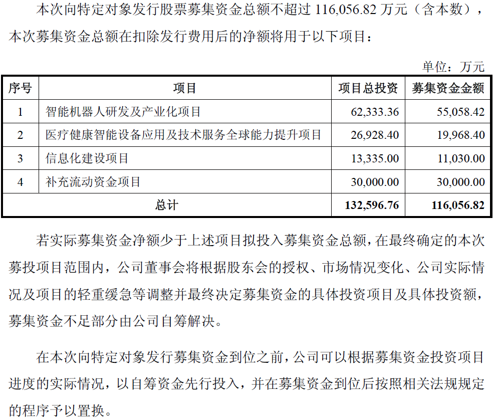 根据公司披露的《关于本次募集资金投向属于科技创新领域的说明》,本次募集资金将主要用于四个项目:智能机器人研发及产业化项目(5.51亿元)、医疗健康智能设备应用及技术服务全球能力提升项目(2亿元)、信息化建设项目(1.1亿元)以及补充流动资金(3亿元)。