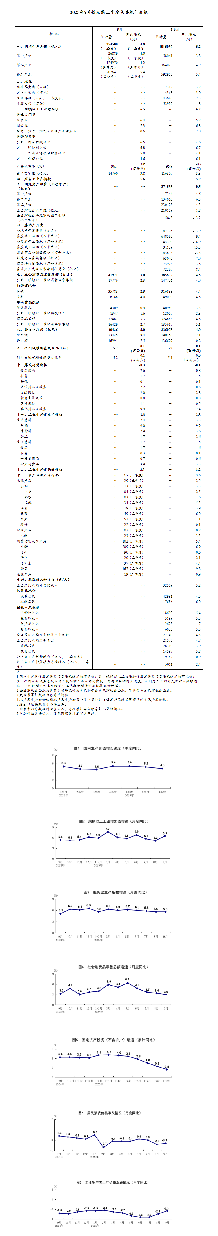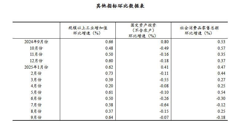 (2)根据季节调整模型自动修正结果,对近一年来各期国内生产总值、规模以上工业增加值、固定资产投资(不含农户)、社会消费品零售总额环比增速进行修订。修订结果及2025年三季度GDP环比数据、2025年9月份其他指标环比数据如下: