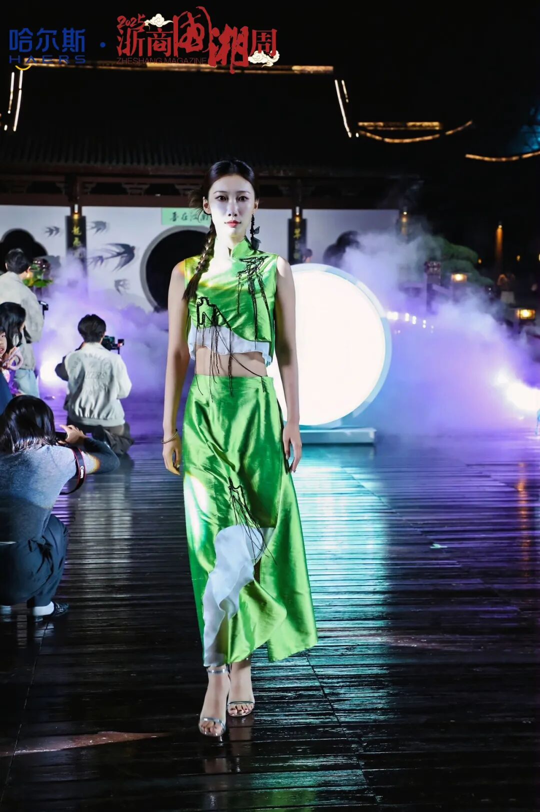 如踏青石板而来,又如水墨长卷展开一般由远及近,吾在江南以东方美学的非遗技艺裹挟着千年水乡的一呼一吸。一件件新中式剪裁的时装一一出场,衣摆摇曳的弧度里,潜藏着西湖烟雨的朦胧与钱塘潮涌的磅礴。
