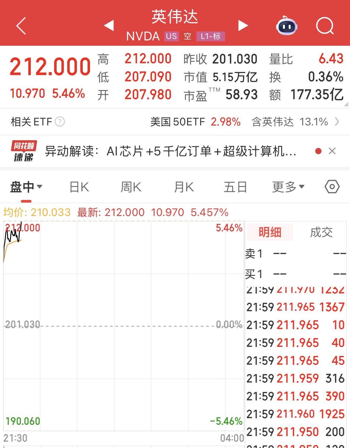 截至发稿,英伟达涨幅扩大至5.46%,总市值达到5.15万亿美元,单日增加超2500亿美元。