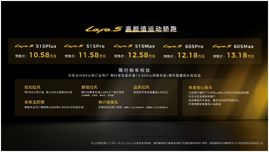 6.年末安心购车:凡在预订期内下订并在Lafa5上市后3天内完成锁单并支付定金尾款的用户,如因零跑汽车原因,需在2026年完成交付,可享受跨年购置税补贴权益;