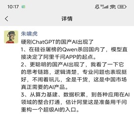 昨日千问app公测上线后,著名投资人金沙江创投朱啸虎在朋友圈中表示,“硬刚ChatGPT的国产AI出现了。1、在硅谷屠榜的Qwen杀回国内了,模型直接决定了阿里千问APP的起点;2、更聪明的国产AI出现了,我看了一下它的思考链路,逻辑清楚,专业问题也表现挺好,不闹着玩儿,全是干货,这是中国市场真正需要的AI产品。3、从算力基建、数据积累,到各种应用在AI领域的整合打通,估计阿里这是准备用千问重构一个超级AI的入口。”