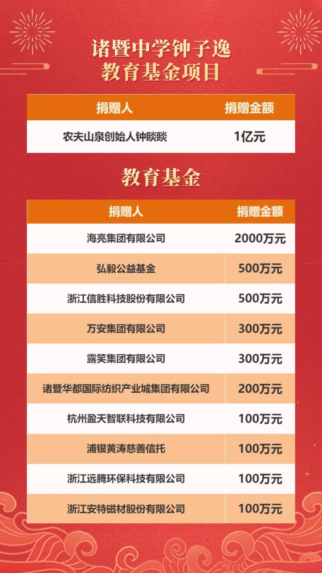 其中,农夫山泉创始人钟睒睒以个人名义向诸暨中学捐赠一亿元人民币,成立诸暨中学钟子逸教育基金项目;海亮集团捐赠2000万元。