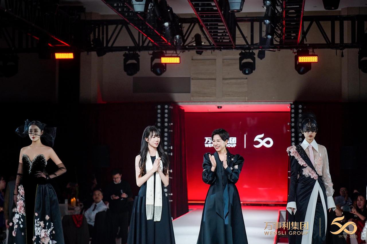 这一天,会场内外,身着大红色连衣裙的万事利集团董事长屠红燕成为全场的焦点;她的爱人、万事利丝绸文化股份有限公司董事长李建华的“数字人”登台亮相,惊艳全场;当晚的丝路晚宴上,先是屠红燕携女儿李翎菡登上T台的中央,接着李建华给女儿送上鲜花,寓意着企业开启的美好未来。