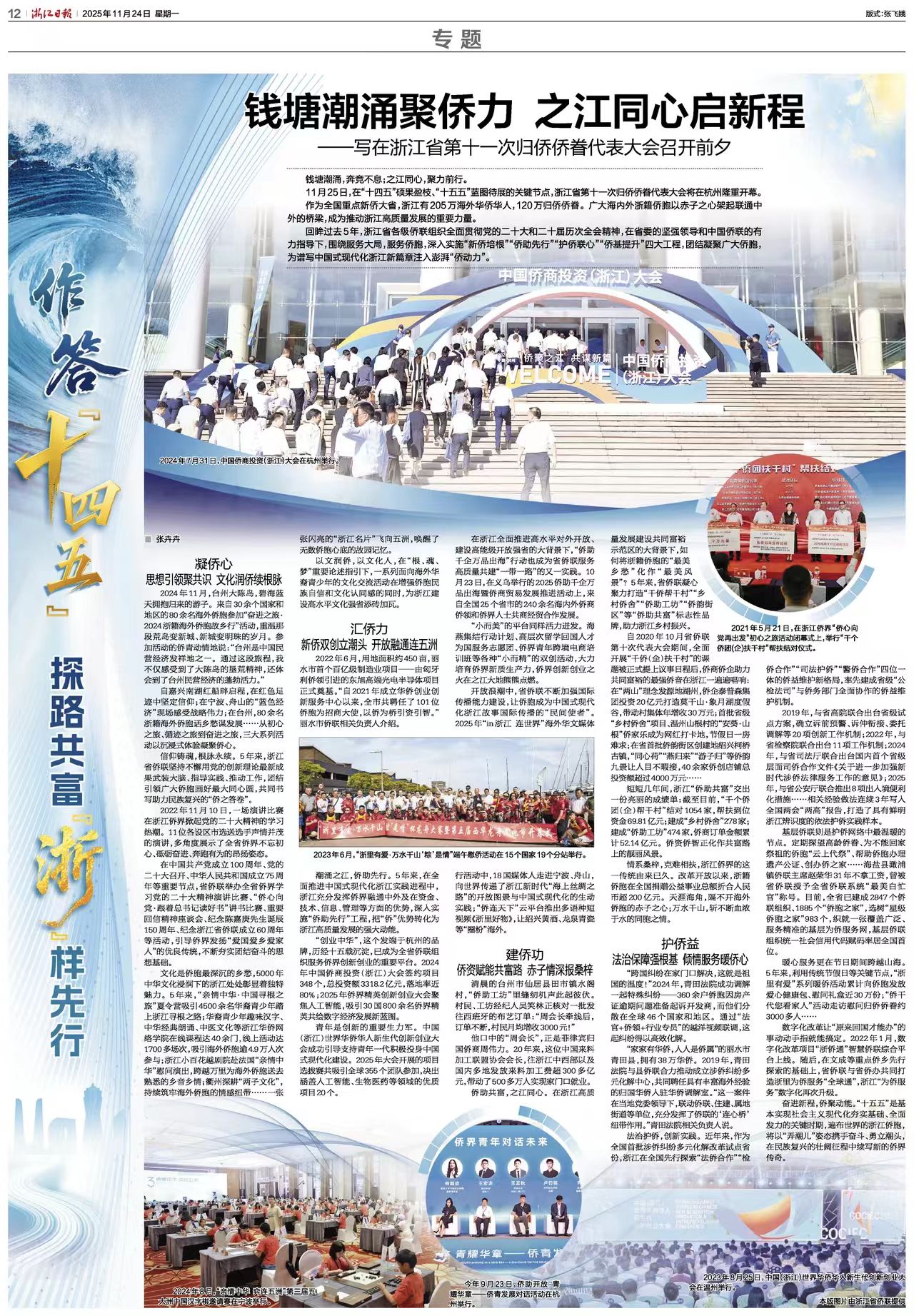 潮涌之江,侨助先行。在全面推进中国式现代化浙江实践进程中,浙江充分发挥侨界融通中外及在资金、技术、信息、管理等方面的优势,深入实施“侨助先行”工程,把“侨”优势转化为浙江高质量发展的强大动能。
