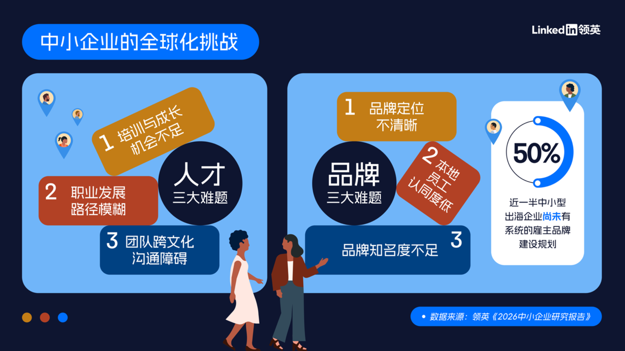中小企业全球化之路受资源制约,领英大中华区总经理王茜表示,与大企业资本渠道扩张不同,中小企业需走差异化、精细化、数字化路径。人才层面,海外中小企业面临培训机会不足、职业路径模糊、跨文化沟通障碍三大难题;品牌建设上,近半出海中小企业缺乏系统雇主品牌规划,品牌定位、认同度与知名度短板凸显,跨文化传播进一步加剧执行难度。