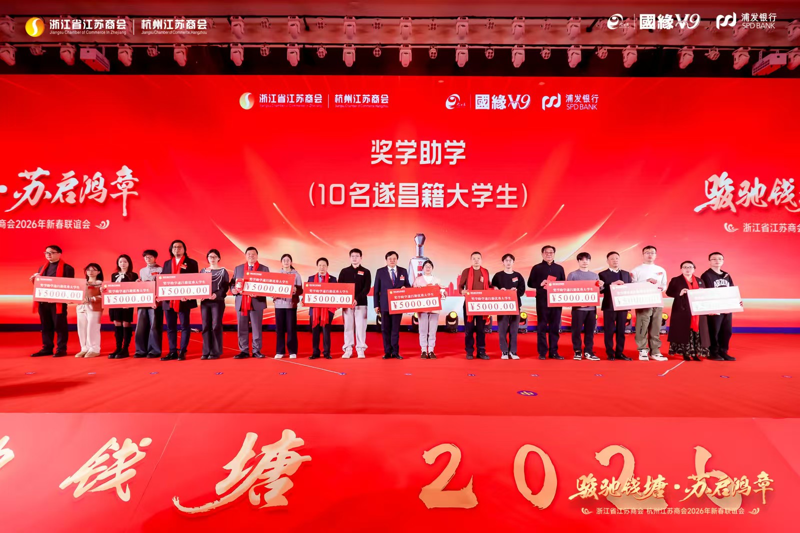 “捐资助学情系桃李 崇德向善爱满校园”。这是2026年1月3日,浙江省丽水市遂昌县工商联在浙江省江苏商会、杭州江苏商会“骏驰钱塘 苏启鸿章”2026年新春联谊会上赠送给商会的大红锦旗,以感谢苏商大爱为山区学子圆梦护航。成为该商会深化“同心共富”助力遂昌“相对薄弱村”消薄攻坚行动注入暖心力量的一个缩影。