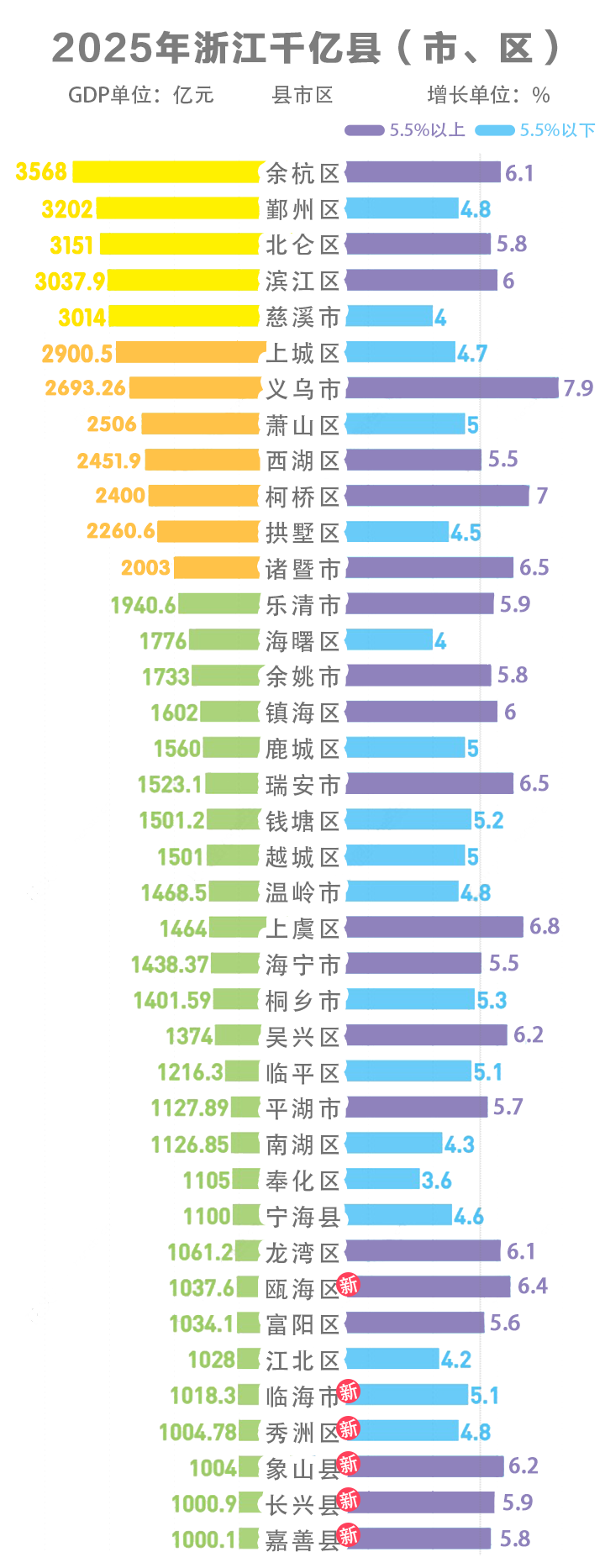 2024年,奉化、江北、龙湾和富阳首次突破千亿大关;2023年,平湖、南湖和宁海成功入围;2022年,临平从老余杭划出后,跨过千亿门槛;2021年,吴兴(包括南太湖新区)成为湖州唯一的千亿元县(市、区)……