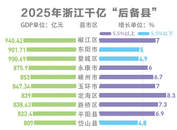 从后备力量来看,2026年具备冲刺千亿的县(市、区)依然不少:GDP超900亿的椒江区、东阳市和婺城区;超800亿的永康市、嵊州市、玉环市、定海区、路桥区、平阳县、岱山县。