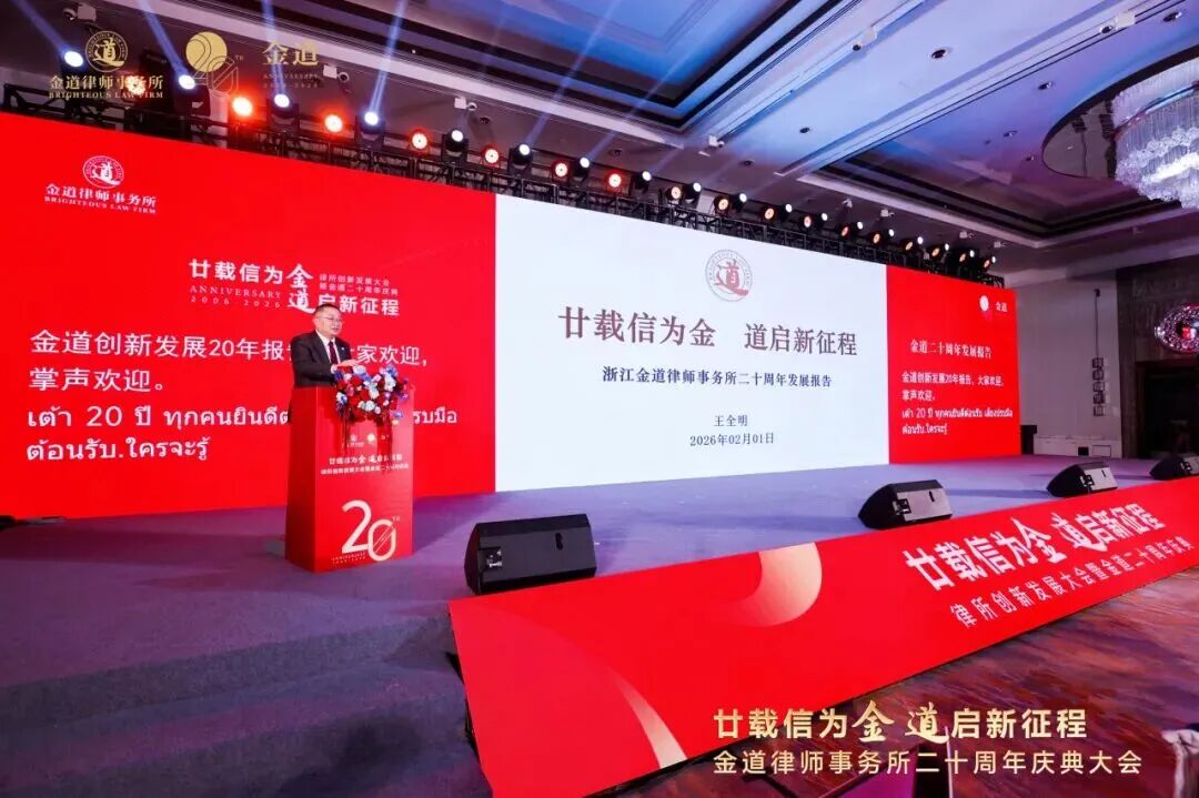 2026年2月1日,浙江金道律师事务所“廿载信为金 道启新征程”创新发展大会暨二十周年庆典在杭州隆重举行。从2006年初创时十几名律师的孜孜探索,到如今汇聚超500名专业人才、规模位列中国律所前100、设有8家分所和泰国办公室、业务网络辐射全球的“全国优秀律师事务所”,金道所二十年跨越式发展的历程,不仅是一家律所坚守初心、砥砺前行的奋斗史诗,更是观察中国本土律所专业化、品牌化、规模化、国际化发展的生动样本。庆典之上,金道二十周年的纪念视频,首席合伙人胡祥甫的开篇寄语,党委书记、主任王全明发布的二十周年发展报告,100万元公益基金与500万元青年律师发展基金的启动、系列文化成果的呈现、国际化顾问团队的聘任,不仅是对过往荣光的致敬,更是对未来蓝图的擘画,深刻揭示了金道所行稳致远的核心密码。