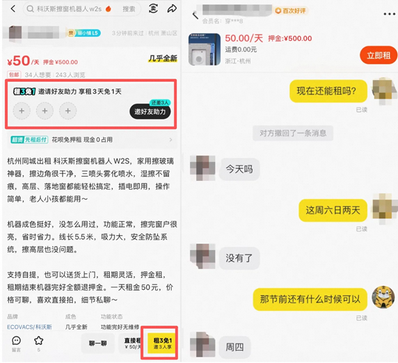 为顺应并推动这一趋势,闲鱼租赁于1月14日推出了“租3免1”方案。买家通过分享邀请3位好友助力,租期满3天及以上即可免除1天租金。这一机制极大地激发了用户的参与热情,数据显示,该活动上线后,用户分享意愿和转化效率极高,分享任务完成率高达68%。除清洁设备外,大疆Pocket 3、专业相机、演唱会手机等3C数码产品的热度也正持续走高。