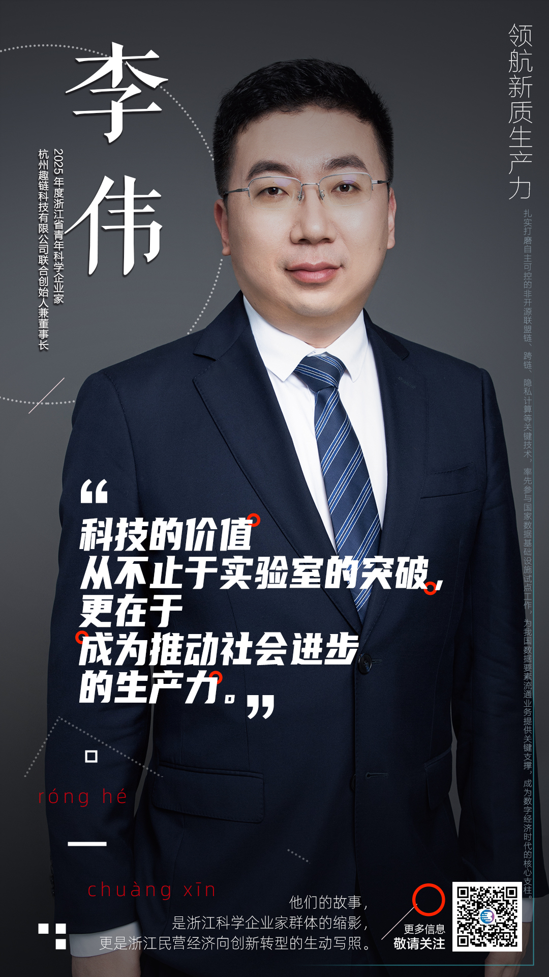 从实验室的技术探索到产业界的实践深耕,从区块链技术的先行者到数据要素市场的开拓者,李伟用十余年的坚守与创新,诠释了浙江科学企业家的责任与担当。在他的带领下,趣链科技不仅成为区块链行业的领军企业,更为新质生产力发展提供了“技术突破+场景落地+生态共筑”的完整范式。正如他所言:“科技创新没有终点,我们要做的,就是永远走在探索的路上,用可信技术链接数字未来。”